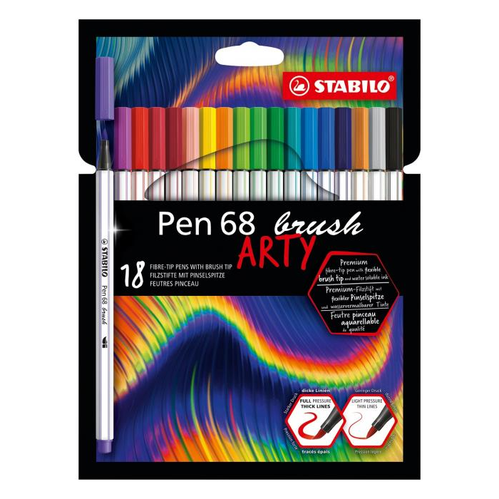So STABILO Pen 68 brush dokonale ovládnete svoje ťahy fixkou, takže môžete ľahko nakresliť krásne línie a vytvoriť skvelé texty v štýle letteringu, ktoré sú teraz fascinujúcim trendom.S novým flexibilným hrotom je táto fixka ďalším prírastkom do rodiny Pen 68 brush, ktorý je vhodný pre začiatočníkov i pokročilých umelcov. Reguláciou tlaku na špičku fixy môžete pomocou `štetcového` hrotu vytvoriť silné alebo tenké línie - v 24 populárnych odtieňoch, vrátane 5 neónových farieb. Vďaka náplni na vodnej báze môžete docieliť ďalšie skvelé efekty: napríklad tieňovanie, miešanie jednotlivých odtieňov alebo použiť fixku ako akvarel.Rozmanité využitie dodá Vašim do-it-yourself projektom a vlastnému designu celkom nový rozmer. Brilantné a zaujímavé kresby sa vyznačujú sýtymi farbami na ktoré budete pyšní! V spoločnosti STABILO spoliehame na viac ako 50 rokov skúseností. Balenie 18 kusov. Farba mix.