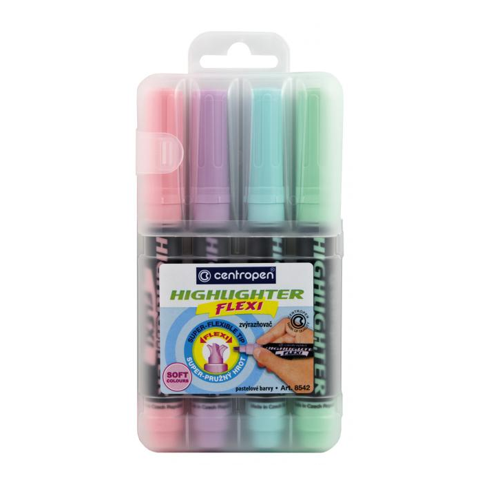 Veľkokapacitný zvýrazňovač so super pružným hrotom na hladké a pohodlné zvýraznenie textu na všetkých druhoch papiera. 4 atraktívne pastelové odtiene. 95 % recyklovaného materiálu.