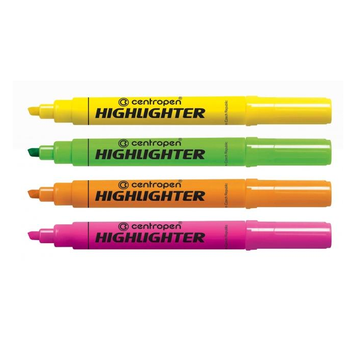 Zvýrazňovač s celofluorescenčným plášťom. Reflexný pigmentový atrament s vysokým stupňom flourescencie a odolnosti proti UV žiareniu. Pre zvýrazňovanie textov na všetkých druhoch papiera. Klinový hrot, šírka stopy 1 - 4,6 mm.