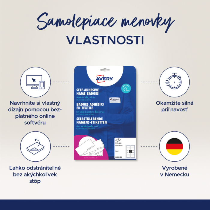 Samolepiace menovky Avery na textil 80x50mm, materiál acetátový hodváb