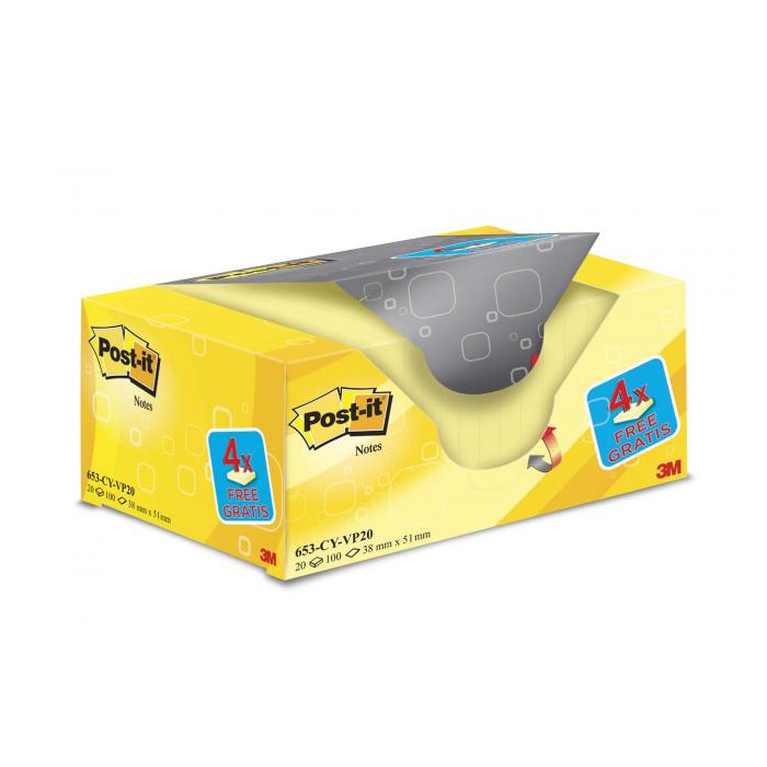 Zvýhodnené balenie žltých bločkov s jednoduchou manipuláciou. Papierový obal roztrhnutím na naznačenom mieste rozdelí balenie na 2 časti, ktoré sa ľahko uskladnia na stole alebo v zásuvke. Rozmery 38 x 51 mm. Počet lístkov 20 x 100.