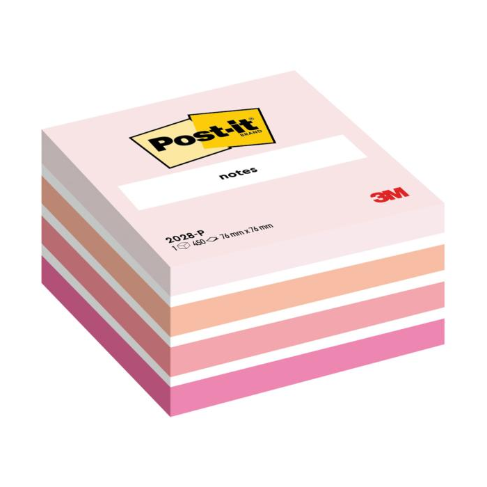 Post‑it® lístky v kocke. Farba ružová v rôznych odtieňoch. 450 lístkov v jednej kocke. Rozmery 76 × 76 mm.