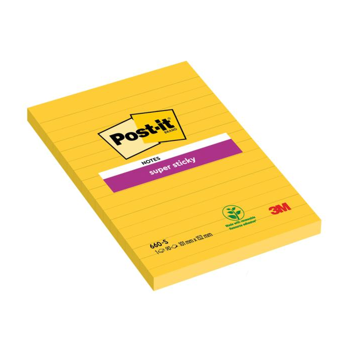 Super lepiace bločky v žltej farbe s linajkovým formátom. Sú vhodné pre štruktúrované poznámky a zefektívnenie organizácie práce. Rozmery: 102 x 152 mm. Počet lístkov: 75.