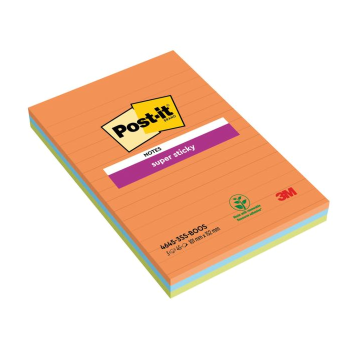 Post-it® silne lepiace bločky majú v porovnaní s originálnymi Post-it® bločkami 2 x vyššiu priľnavosť. Sú veľmi pevné, mimoriadne univerzálne a dodávajú sa v rôznych žiarivých a živých farbách, aby na nich všetky informácie alebo odkazy vynikli. Rozmer 101x152 mm s linajkami. Počet lístkov 3 x 45.