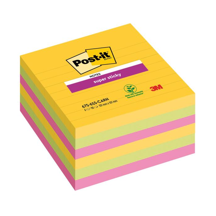 Samolepiace bločky Post-it® vo veľkom formáte v rôznych živých farbách. Vďaka špeciálnemu lepidlu držia lístky aj na nerovnom povrchu a po odlepení nezanechávajú stopy po lepidle. Rozmery 101x101 mm. Počet lístkov 6x90.
