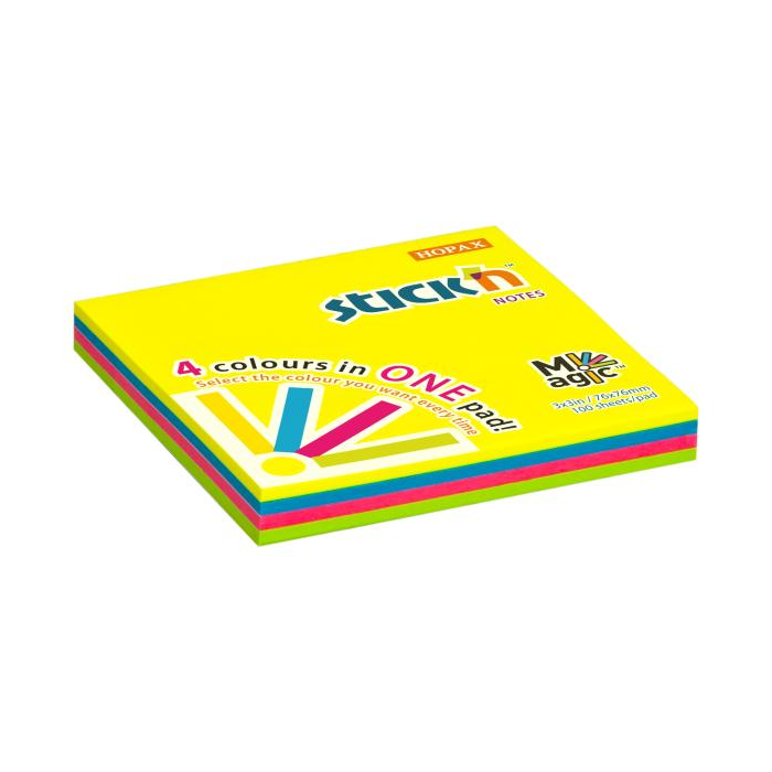 Samolepiaci bloček Stick’n Hopax MAGIC 4 neónové farby, 76 x 76 mm, 100 lístkov