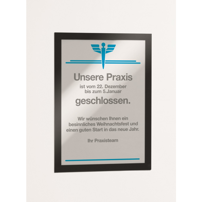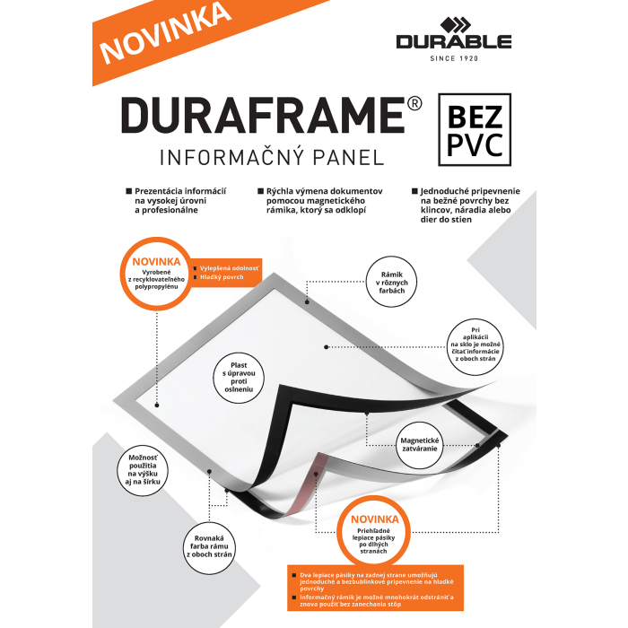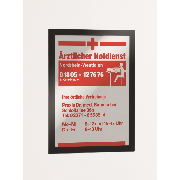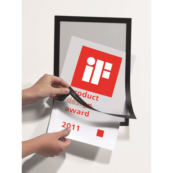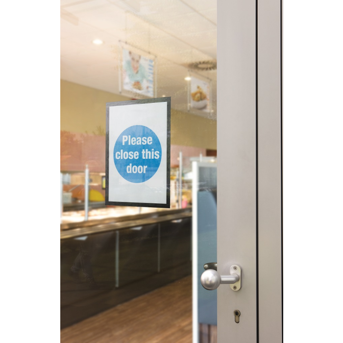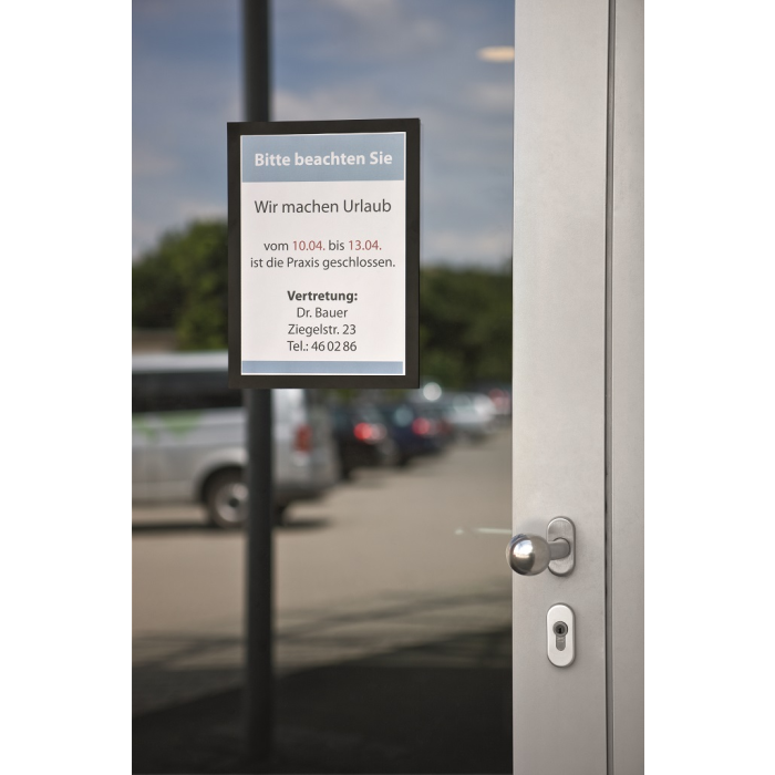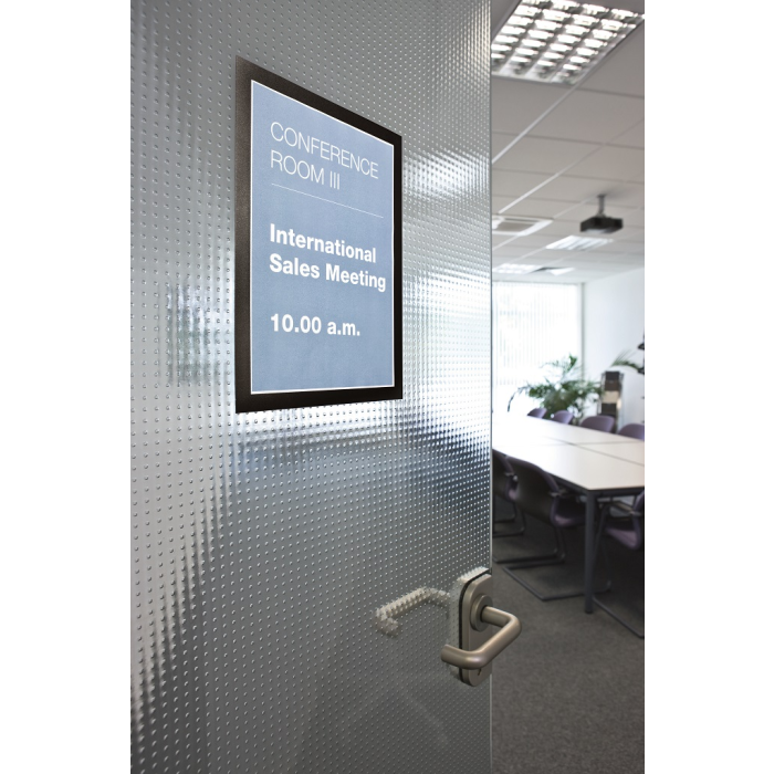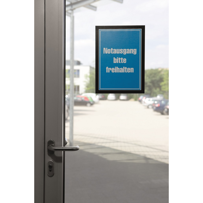 Samolepiaci informačný panel s prednou magnetickou časťou. Ideálny na vystavovanie plagátov, kľúčových informácií, špeciálnych oznamov alebo dôležitých čísel. Informácie sa ľahko vymieňajú a sú čitateľné z oboch strán, ak sa panel umiestni napr. na okno alebo priehľadné dvere. Vhodný na hladké a pevné povrchy. V prípade potreby je ľahko premiestniteľný bez potreby vŕtania. Formát A4, rámik čierny.