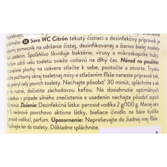 Tekutý čistiaci a dezinfekčný prípravok pre čistú, dezinfikovanú a žiarivo bielu toaletu bez usadenín spoľahlivo likviduje baktérie, vírusy a mikroskopické huby. S citrónovou vôňou, ktorá zanechá toaletu sviežu po dlhú dobu. Objem 750 ml.