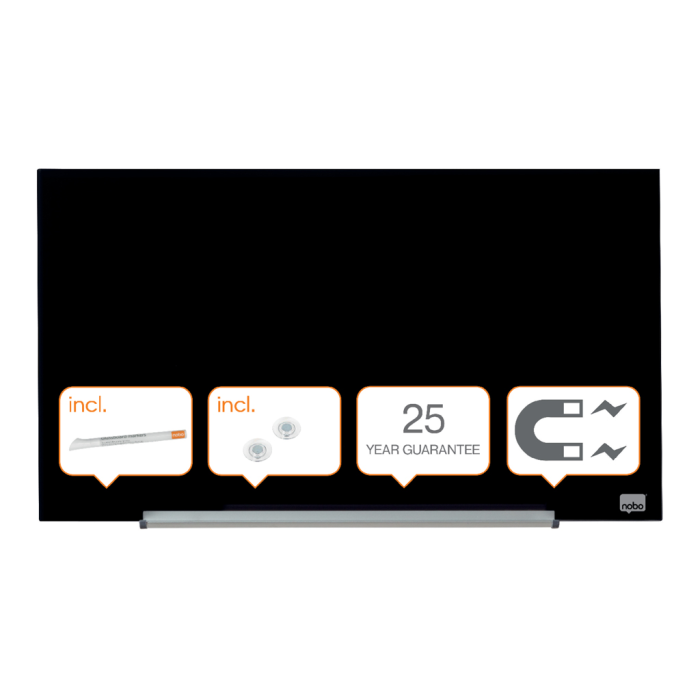 Na širokouhlé sklenené tabule Nobo sa vojdú všetky vaše nápady! Širokouhlý formát a minimalistický rámček maximalizujú využiteľnú plochu na písanie. So systémom InvisaMount™ bude inštalácia na stenu bezproblémová a navyše všetky montážne prvky sú úhľadne schované za doskou tabule. Takže tabule majú moderný a štýlový dizajn. Tabuľa je dodávaná s vysokokvalitným odnímateľným odkladačom na popisovače. Magnetický sklenený povrch zaručuje najlepšiu možnú mazateľnosť a je vhodný na každodenné používanie. Veľkosť uhlopriečky: 31” (79 cm).