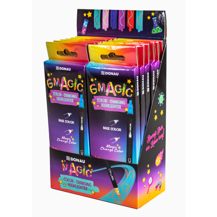 Zvýrazňovač s funkciou zmeny farby. Obojstranný zvýrazňovač s hrotom v tvare sekáča (základná farba) a okrúhlym hrotom (magická farba). Najprv zvýraznite text základnou farbou (hrot v tvare sekáča) a nechajte ho krátko zaschnúť. Potom zvýraznite jednotlivé slová druhým hrotom; farba sa magicky zmení. 6 rôznych farieb. Dĺžka pera 16,4 cm, vetrané uzávery. Šírka čiary hrotom v tvare sekáča 1 - 4 mm. Balené v puzdre s pútkom na zavesenie v európskom štýle.
