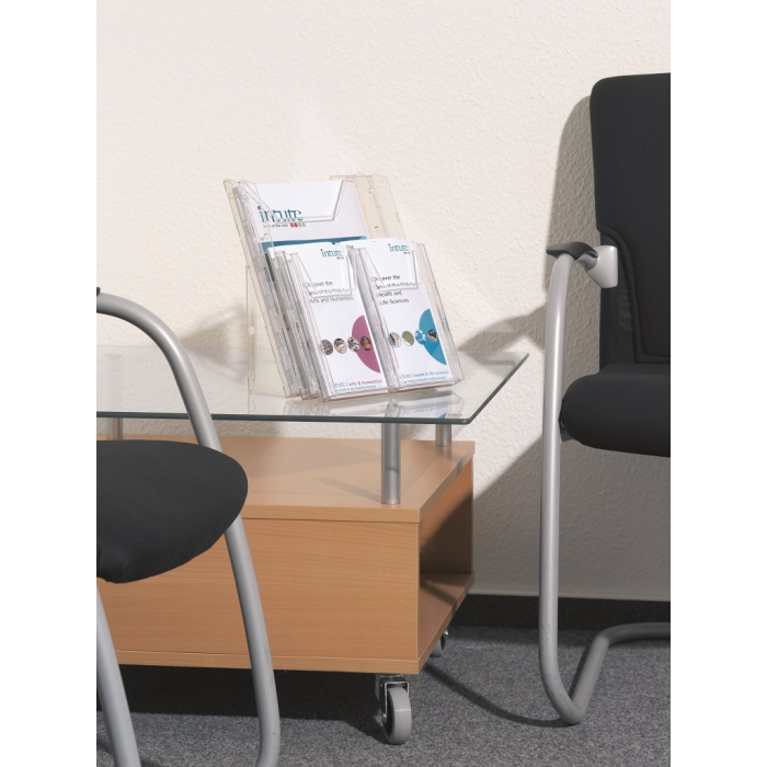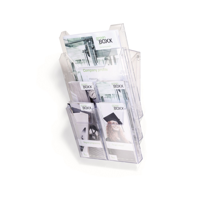 Kombinovaný stojan COMBIBOXX A4 s odkladačom A4 vnútorných rozmerov 240 × 311 mm a štyroch odkladačov 1/ 3 A4 (DL alebo A6) s hĺbkou 24 mm. Možnosť aplikácie na stenu alebo stôl. Materiál priehľadný plast.