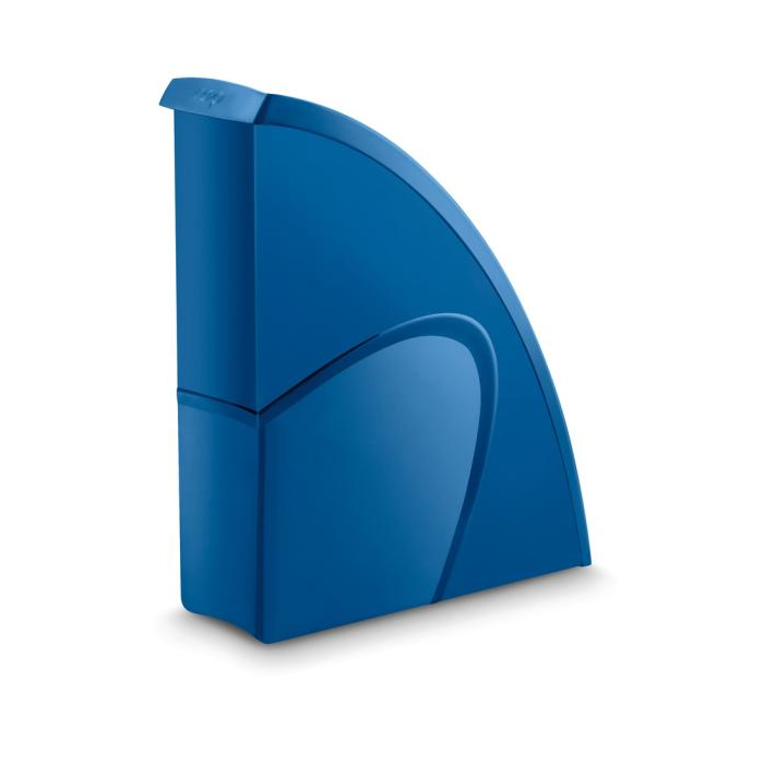 Stojan na časopisy s možnosťou vertikálneho alebo horizontálneho postavenia má elegantné línie, zvýraznené materiálom s kontrastným matným povrchom na hladkom pozadí. Vhodný na dokumenty do veľkosti 24 × 32 cm. Kapacita 700 listov (80 g / m²), rozmery 270 × 85 × 310 mm. Materiál 100% recyklovateľný vysokokvalitný plast. Väčšie balenie 10 ks. Farba modrá.