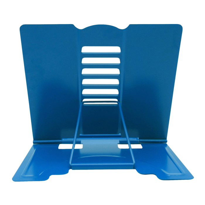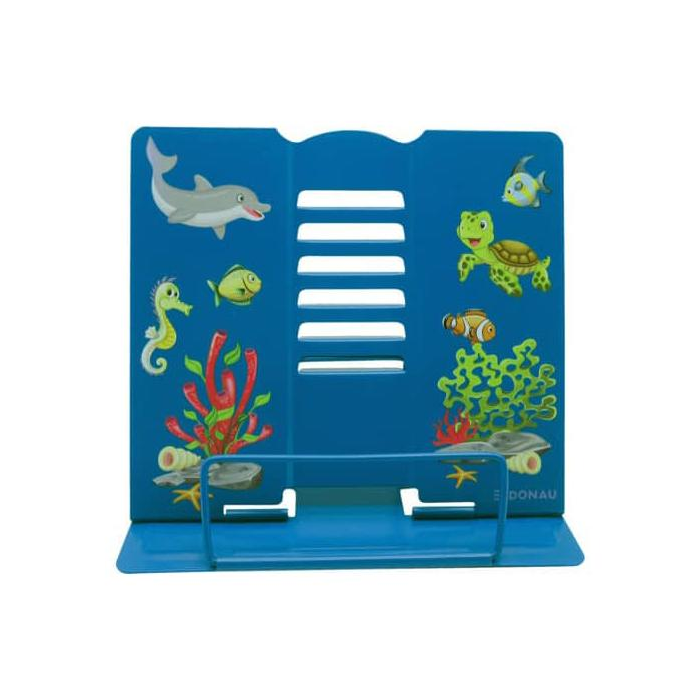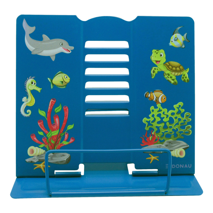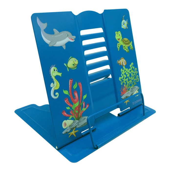 Kvalitný stojan na čítanie z lakovaného kovu, s potlačou zvieratiek, vhodný aj pre ťažké knihy a tablety, s protišmykovými gombíkmi, nastaviteľná výška/uhol sklonu v 5 stupňoch, pri nepoužívaní sa zloží na plocho pre úsporu miesta pri preprave a úložný priestor, s uzamykacou konzolou na otvorenú stranu, všestranný v škole, kancelárii, kuchyni alebo ako stojan na noty, rozmer základne 21 x 16,5cm, výška 15,7 cm, motív Zvieratká, modrý.