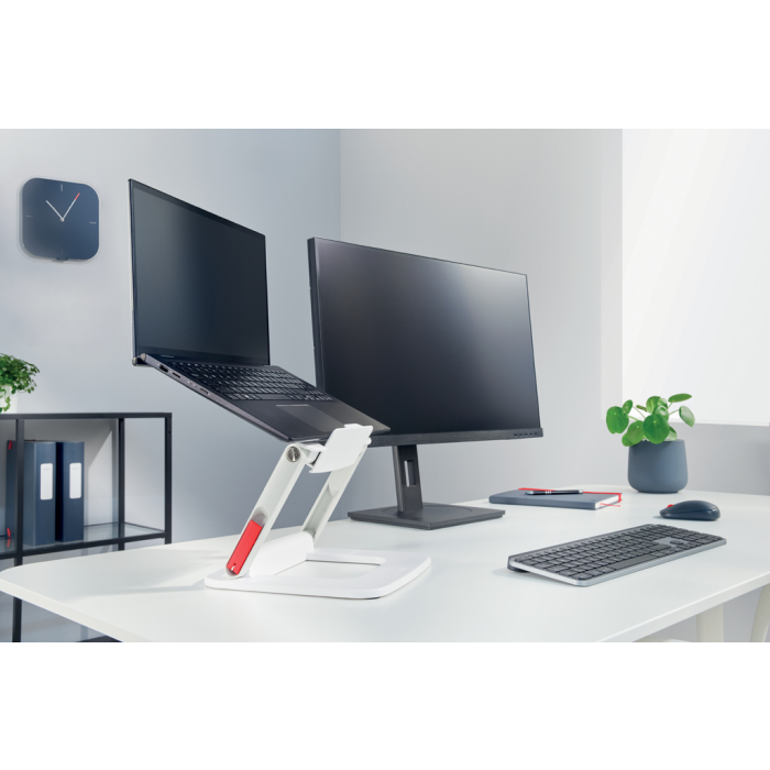 Viacuhlý stojan na notebook Leitz Ergo dvíha obrazovku notebooku do ideálnej ergonomickej výšky, čím zvyšuje pohodlie pri sledovaní a pomáha zlepšiť držanie tela. Rôzne kombinácie výšky a uhla vrátane horizontálneho nastavenia s malými rozmermi pre kompaktné stoly. Použitie stojana pod notebook tiež podporuje prúdenie vzduchu, čím sa zabraňuje prehrievaniu batérie notebooku a ďalších komponentov a notebook si tak udržuje vysokú úroveň výkonu.