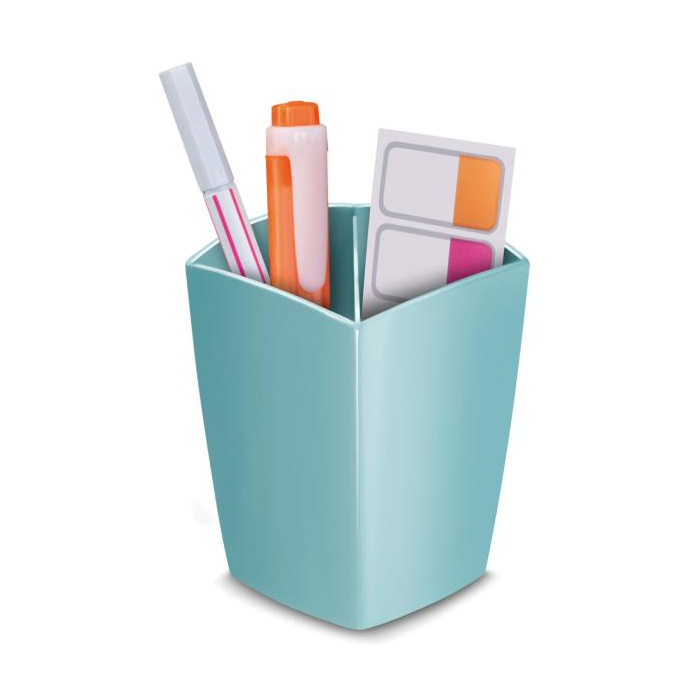 Stojan na ceruzky a perá v modernom dizajne, vhodný do kancelárie, aj do bytu. Vynikajúca stabilita, dve priehradky. Kapacita 32 pier, celkové rozmery 74 × 74 × 95 mm. Materiál 100% recyklovateľný, vysokokvalitný plast. Stojan GreenSpirit v mentolovej farbe je vyrobený zo 100% recyklovaných materiálov, jednotlivé kusy sa môžu navzájom jemne farebne líšiť. Väčšie balenie 12 ks. Farba mentolová.