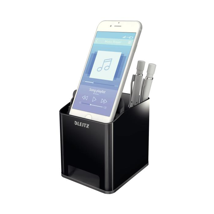 Neprehliadnuteľný štýlový stojan na perá v prémiovej kvalite Leitz v štýlových žiarivých farbách WOW. Extra odkladač pre smartphone do veľkosti iPhone 6 plus so špeciálnou funkciou pre zosilovanie zvuku, veľa miesta pre písacie potreby, pravítko, stylus a iné drobnosti. Moderný dizajn, ktorý vyzerá rovnako dobre v kancelárii, ako aj doma na pracovnom stole, dobre dopĺňa ostatné produkty radu WOW. Farba čierna.