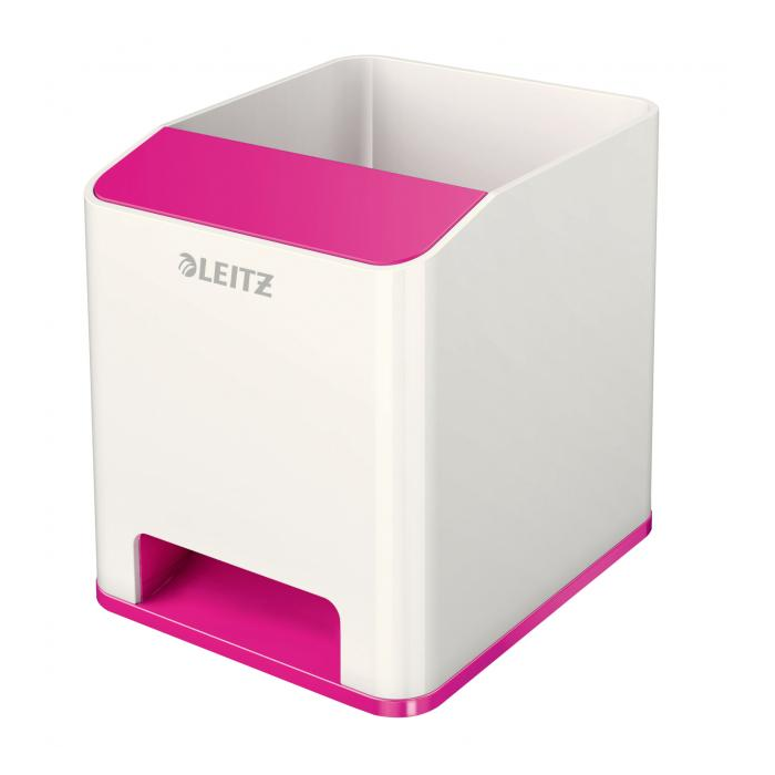 Neprehliadnuteľný štýlový stojan na perá v prémiovej kvalite Leitz v štýlových žiarivých farbách WOW. Extra odkladač pre smartphone do veľkosti iPhone 6 plus so špeciálnou funkciou pre zosilovanie zvuku, veľa miesta pre písacie potreby, pravítko, stylus a iné drobnosti. Moderný dizajn, ktorý vyzerá rovnako dobre v kancelárii, ako aj doma na pracovnom stole, dobre dopĺňa ostatné produkty radu WOW.
