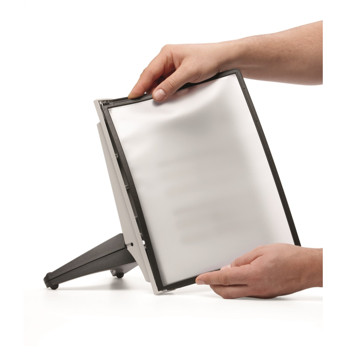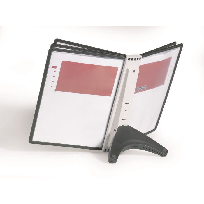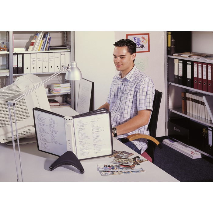 Stojan na stôl s 5 polypropylénovými displejovými panelmi formátu A4 do malých kancelárií. Stabilná základňa, systém ideálny pre užívateľov, ktorí sú obmedzení nedostatkom miesta. Farba základne i panelových rámčekov čierna. Kapacita panelov: 5 Dodávaný: s panelmi Farby panelov: čierna