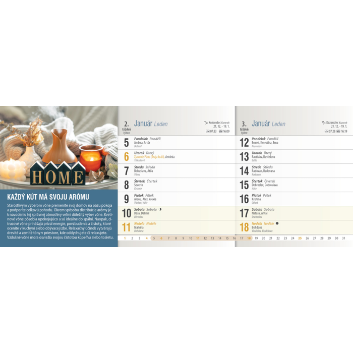 Dvojtýždňový kalendár prináša zaujímavé tipy, triky, nápady a inšpirácie, ktoré využije každý, či už býva v byte, dome, či trávi čas na záhradke. Obsahuje riadkové kalendárium so slovenskými a českými menami, štátnymi sviatkami oboch krajín, východmi a západmi Slnka, fázami Mesiaca a školskými prázdninami.