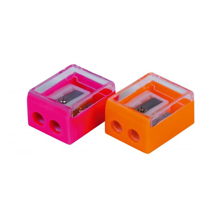 Dvojité plastové strúhadlo so zásobníkom na štandardné a farebné ceruzky. Dodávané v mixe farieb bez možnosti výberu konkrétnej farby. Väčšie balenie 40 ks.