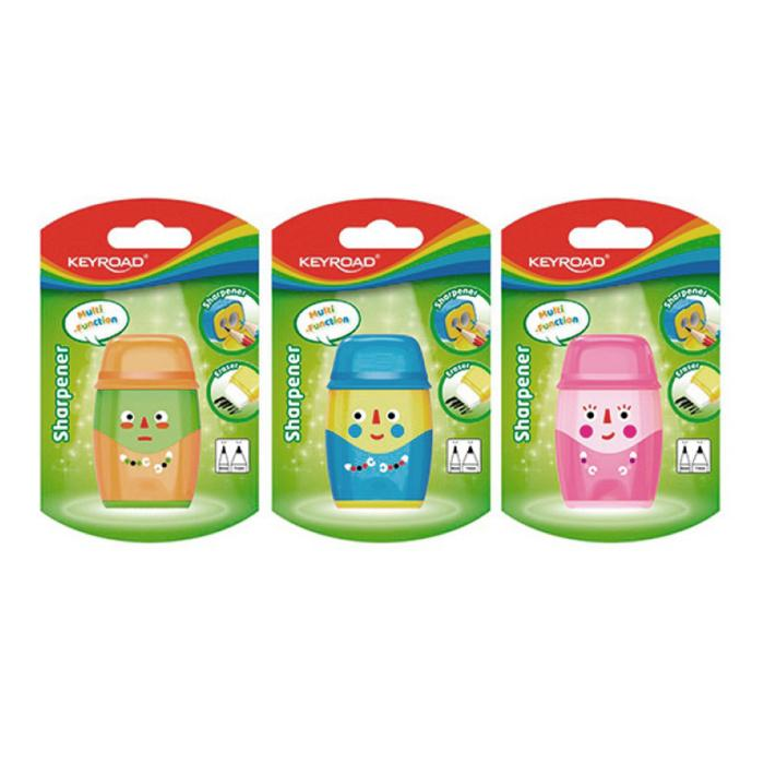 Strúhadlo KEYROAD Hello plastové s dvomi otvormi a gumou, blister, mix farieb