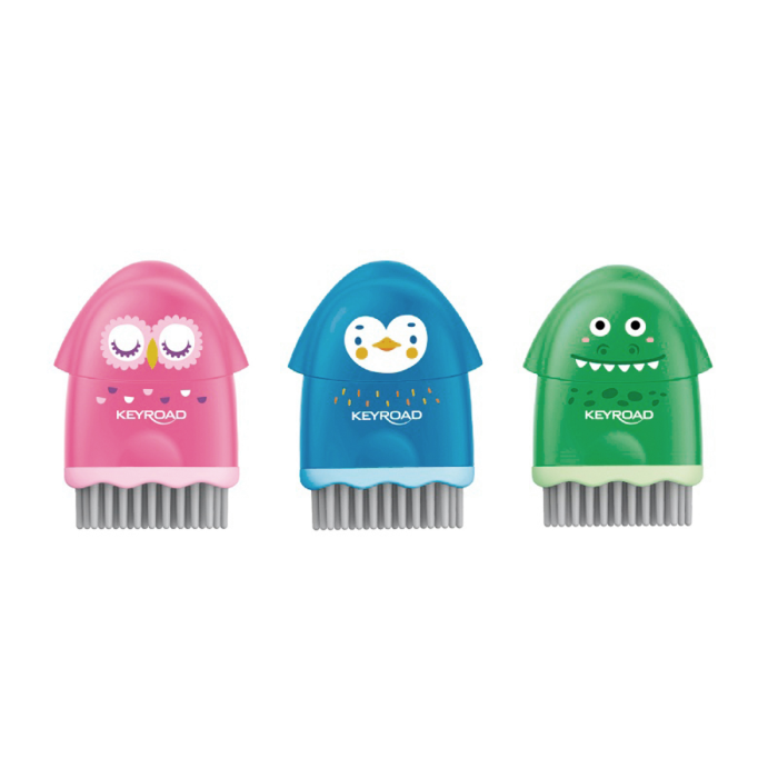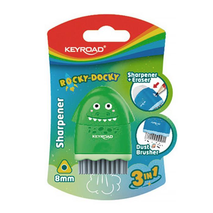 KEYROAD Rocky-Docky jednoduché plastové strúhadlo, šikovné a ľahko skladovateľné. So zábavnou potlačou, ktorá upúta pozornosť. Kombinuje tri funkcie: strúhadlo, gumu a štetec a vďaka tejto jedinečnej kombinácii je mimoriadne praktické na každodenné použitie. Priemer otvoru: 8 mm. Balenie: blister. Farba: mix farieb.
