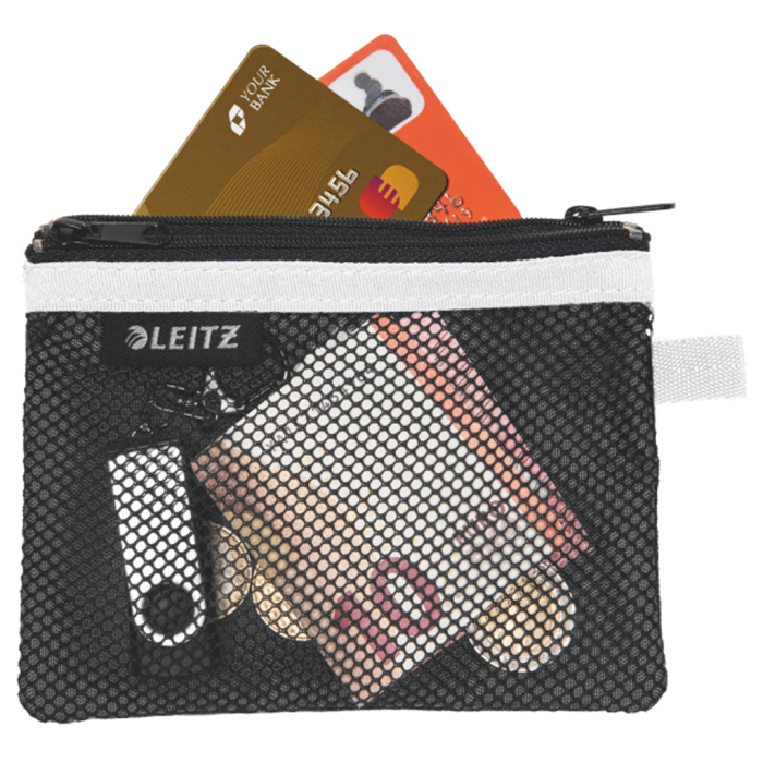 Vysokokvalitné puzdrá s 2 priehradkami na organizáciu a ochranu menších osobných vecí, ako sú občiansky preukaz alebo platobné karty, vnútri nepriehľadnej priehradky a slúchadiel alebo káblov vnútri sieťovanej priehradky. Farba čierna.