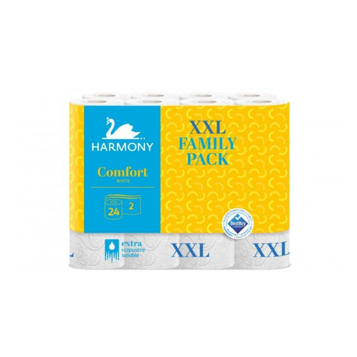 HARMONY Comfort - dvojvrstvový neparfumovaný papier, belosť až 78%, balenie 24 kotúčikov, návin kotúčika 18 m.