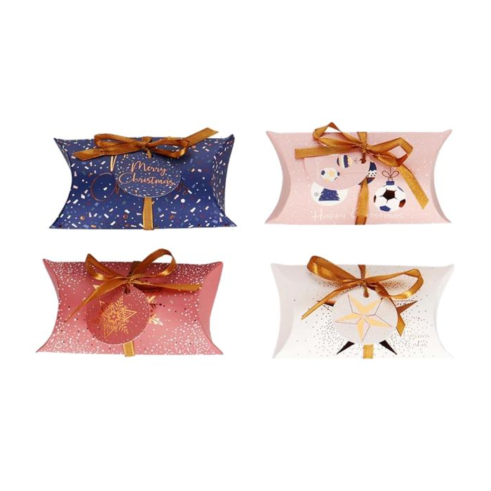 Papierová darčeková krabička pukačka 150x70mm 8 ks mix 4 vianočných motívov. Previazané stuhou s visačkou, elegantný dizajn vhodný na každú príležitosť. Ideálne na balenie malých darčekov, ako sú šperky, darčekové poukážky.