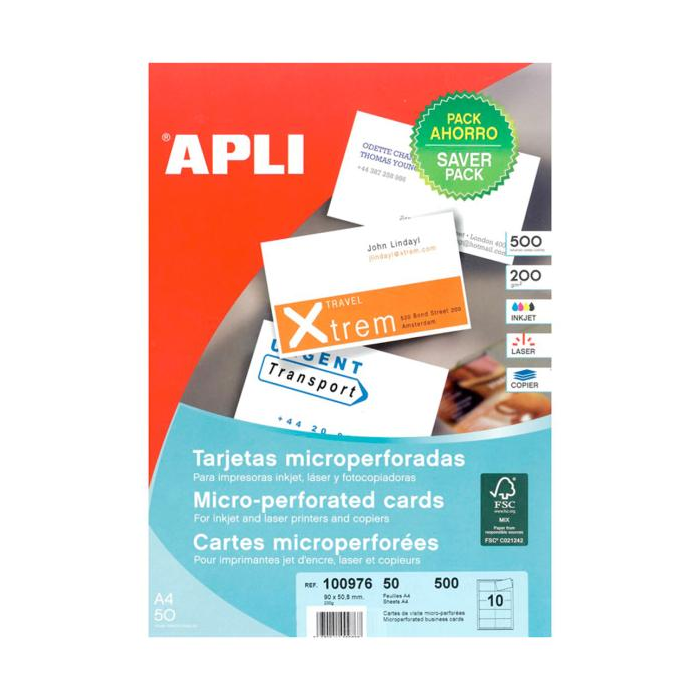 Hárky kvalitného bieleho papiera, určené na výrobu 10 vizitiek veľkosti 90 × 50,8 mm z jedného hárku A4. Mikroperforácia umožňuje po tlači jednotlivé vizitky z papiera oddeliť. Pri detailnom pohľade vidieť jemne vrúbkovaný okraj vizitky. Vhodné do atramentových a laserových tlačiarní a kopíriek. Papier na 500 vizitiek.