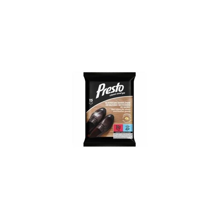 PRESTO CLEAN - VLHČENÉ OBRÚSKY NA TMAVÚ OBUV 15 KS. Presto Clean vlhčené utierky na tmavé topánky sú praktickým riešením na rýchle a efektívne čistenie a ošetrovanie bielych topánok, ktoré sú náchylné na špinu a škvrny. Tieto špeciálne navrhnuté utierky okamžite odstraňujú nečistoty, prach a škvrny z povrchu topánok, čím udržiavajú ich pôvodnú farbu a čistý vzhľad. Vďaka svojmu zloženiu Presto Clean utierky šetrne čistia rôzne materiály, vrátane kože, syntetických materiálov a textílií, bez toho, aby zanechávali škvrny alebo stopy. Sú ideálnym pomocníkom na rýchle čistenie v teréne alebo doma, a zároveň zanechávajú topánky svieže a žiarivé. Ich kompaktné balenie je vhodné na cesty, takže si môžete svoje biele topánky udržiavať čisté kdekoľvek a kedykoľvek. Hlavné vlastnosti: Efektívne odstraňujú prach, špinu a škvrny. Vhodné na biele kožené, syntetické a textilné topánky. Nezanechávajú šmuhy ani stopy Jednoduché použitie - ideálne na cesty alebo rýchle čistenie.