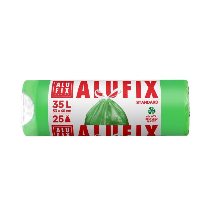 Vrecia na odpadky, zaťahovacie, vyrobené z HDPE materiálu, zelené. Vrece určené do domácností alebo kancelárie a vďaka zaťahovaciemu systému veľmi praktické. Rozmer vreca 53 x 60 cm, objem 35 litrov, množstvo 25 ks na rolke, hrúbka 14 mikrónov.