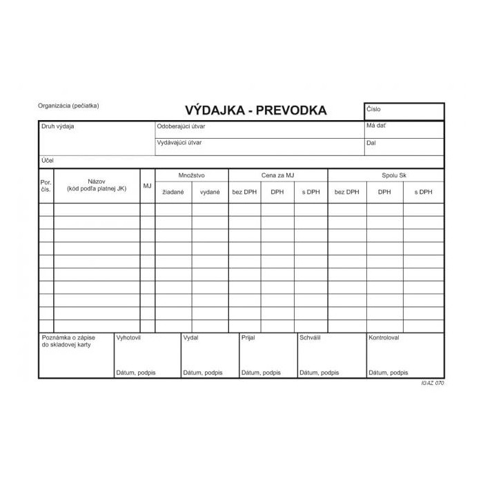 Obchodné tlačivo. Výdajka - prevodka s DPH, samoprepis s kartónovou obálkou - podložkou, A5, blok, 100 listov.