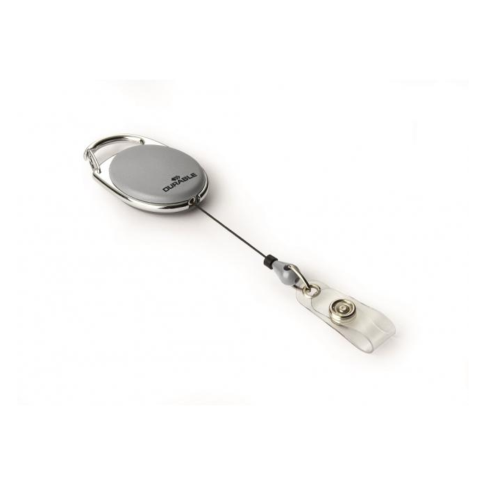 Štýlový oválny vysúvací kotúč s možnosťou vysunutia do 80 cm a kovovým klipom na rubovej strane. Vhodný na uchytenie všetkých visačiek značky DURABLE s perforáciou. Balenie 10 ks. Farba: sivá