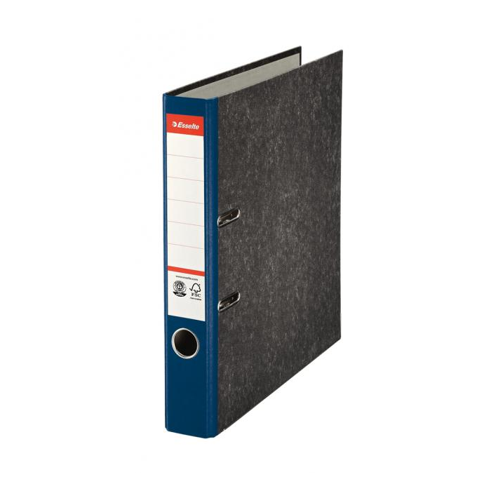 Štruktúrovaný papierový poťah s čiernym mramorovým vzorom, formát A4. Zakladač vybavený rado zámkom a nalepeným chrbtovým štítkom. Páková mechanika v dizajne MATT s prítlačnou lištou. Šírka chrbta 5 cm. Balenie 25 ks. Chrbát: 5 cm Farba: modrá