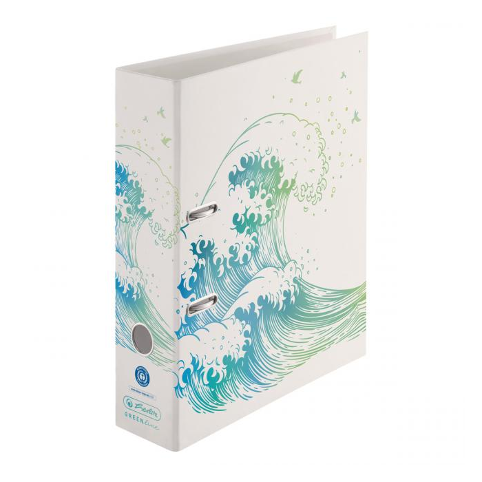 Zakladač maX.file A4/8cm v dizajne GREENline bez štítku. Páková mechanika, radokrúžok, v krémovej farbe s vnútornou stranou z recyklovanej sivej, motív Vlna. Certifikát FCS a Blue Angel.