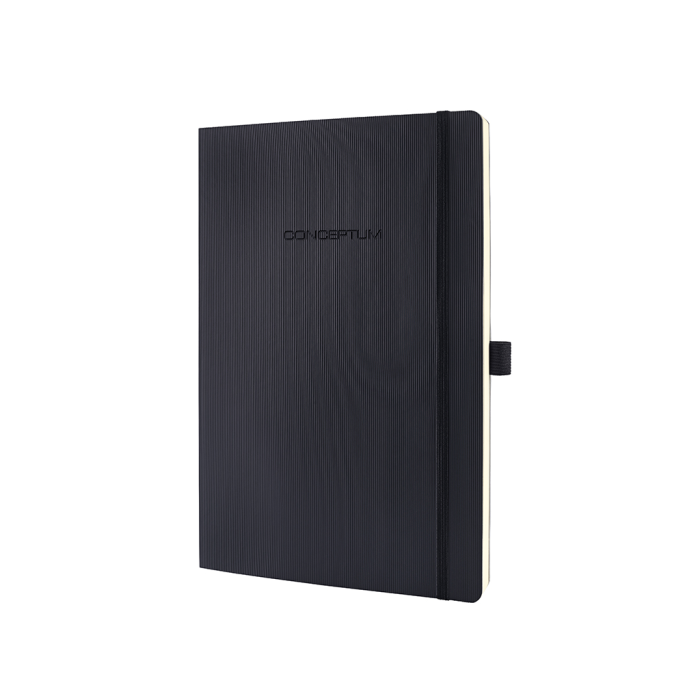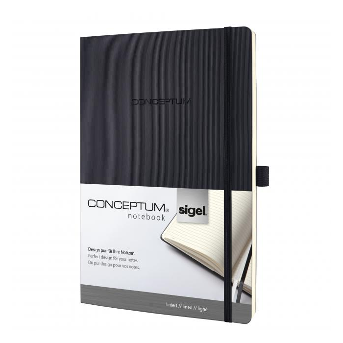 Zápisník s mäkkými doskami a uzatváraním na gumičku. Čistý a jednoduchý dizajn až do posledného detailu. Moderný, elegantný, so zameraním na to podstatné. To je CONCEPTUM®, víťaz medzinárodnej ceny za dizajn. Nóbl sofi stikované zápisníky jedinečného štýlu, ktorý môžete vidieť aj cítiť, sú vhodné pre profesionálnu, ako aj pre osobnú potrebu. S citlivosťou volené materiály a vynikajúca kvalita sú skombinované so skutočnou eleganciou. Zápisníky sú vybavené osobným adresárom, uškom na pero, 2 lacetkami, vreckom na uchovanie materiálov s miestom na vizitku, k dispozícii je 20 perforovaných strán pre potreby vytrhnutia poznámok, strany v zápisníku sú číslované. Formát A4, úprava linajková. Počet strán 194. Farba čierna.