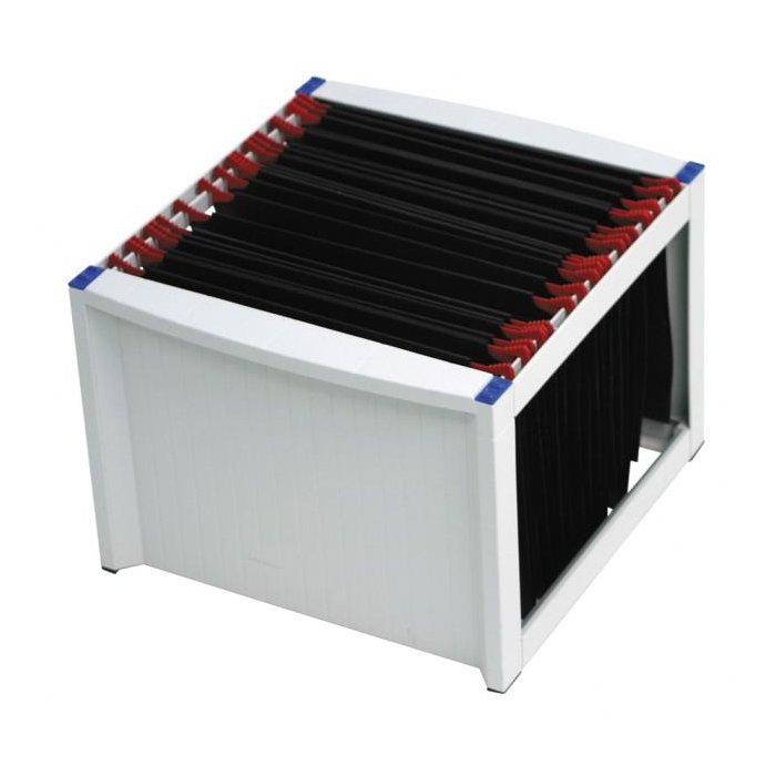 Zásobník vhodný na závesné obaly A4 s prístupom zhora. Jednoduchá montáž, možnosť stohovania. Kapacita cca 40 závesných obalov typu V.