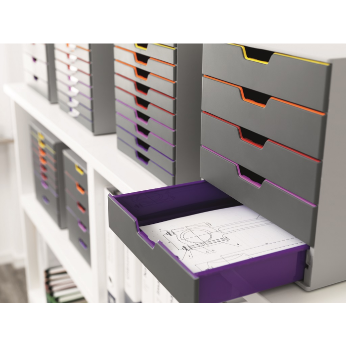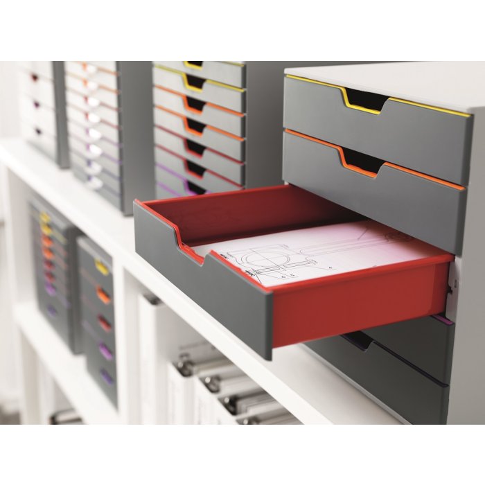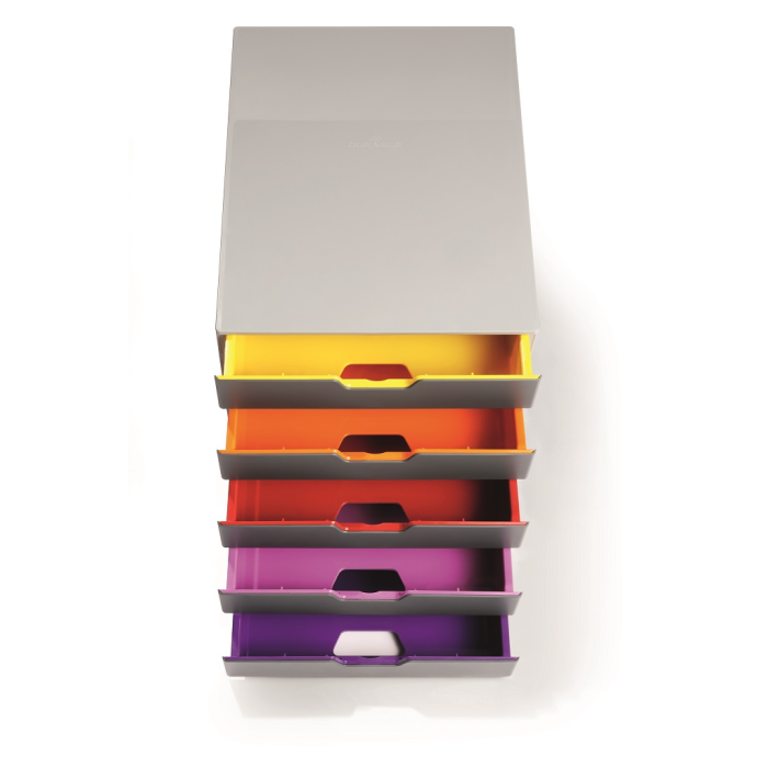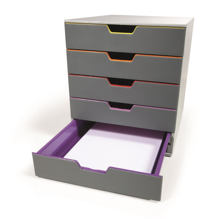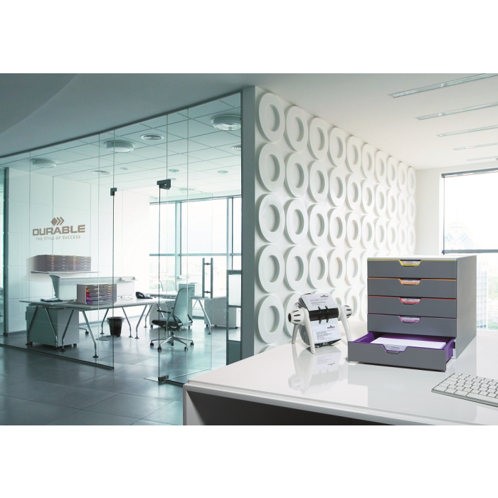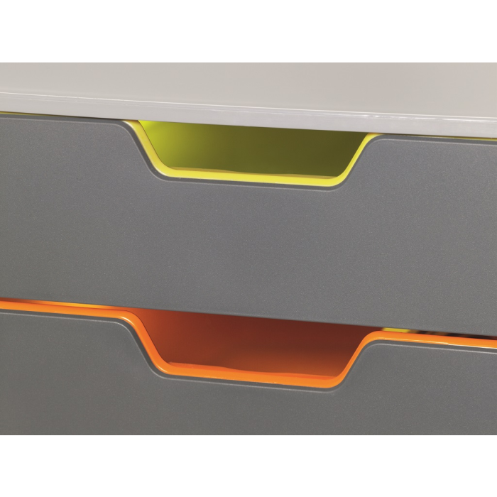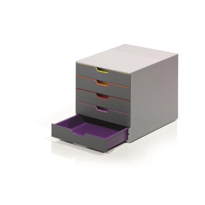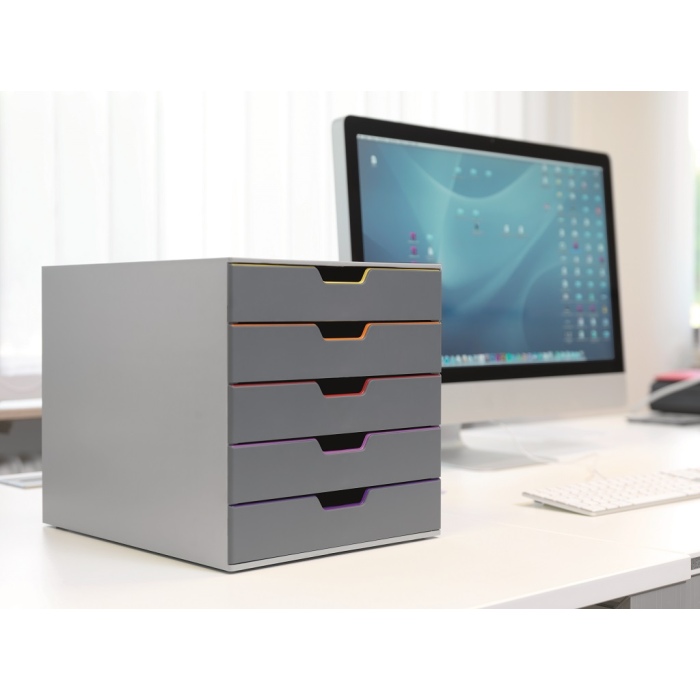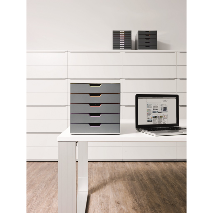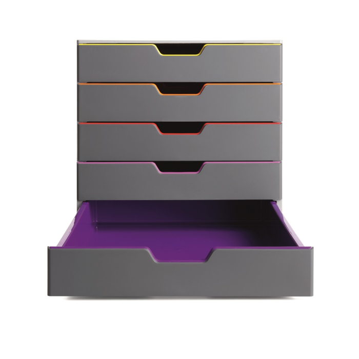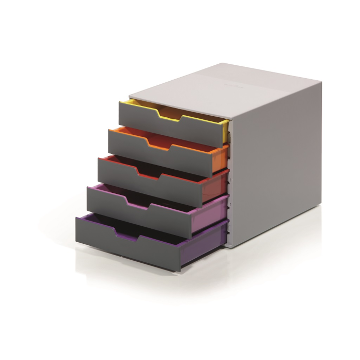 Boxy s 5 zásuvkami s vnútrami dúhových farieb dodajú kancelárii nádych elegancie. Pri ich zatvorení farebné línie iba jemne vystupujú z elegantnej sivej farby, pri otvorení sú žiarivé farby dúhy potešením pre oči. Dodávané s priehľadnými plastovými indexami na označenie obsahu. Boxy sú stohovateľné, zásuvky zabezpečené proti vypadnutiu. Materiál najkvalitnejší ABS plast, tichý a ľahký posun zásuviek, spodná strana s protišmykovou ochranou. Víťaz Product design award 2013. Rozmery (š × v × h) 292 × 280 × 356 mm.