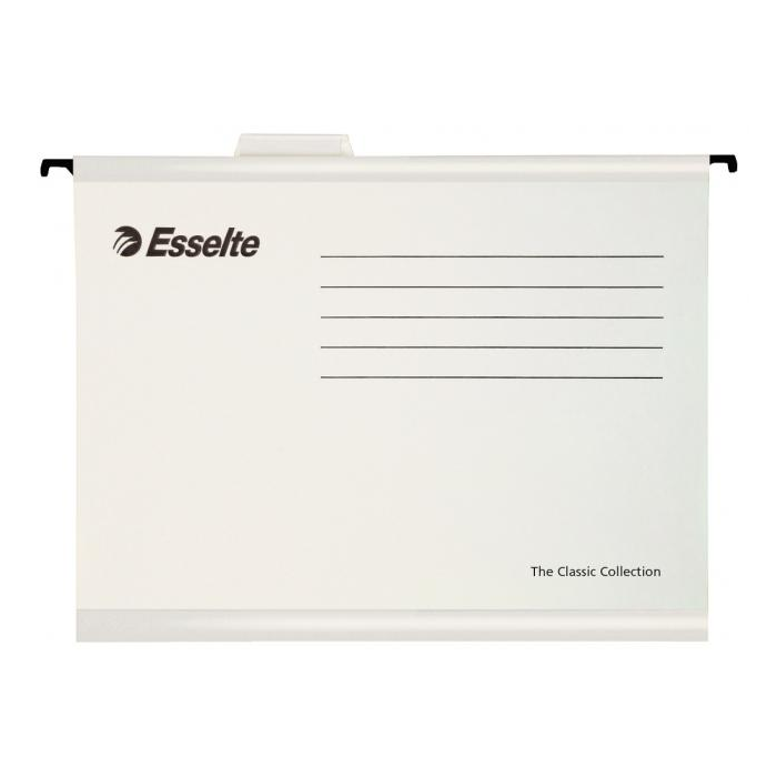 Závesné obaly Esselte kolekcie Classic vyrobené z pevného kartónu. Lisované dno obalu dovoľuje zvýšiť kapacitu na 30 mm. Súčasťou obalu je násuvný index z priehľadného plastu s výmenným papierovým štítkom. Formát A4, rozpätie vodiacich líšt 330 mm.