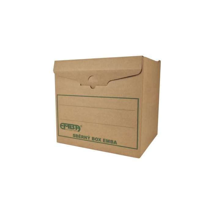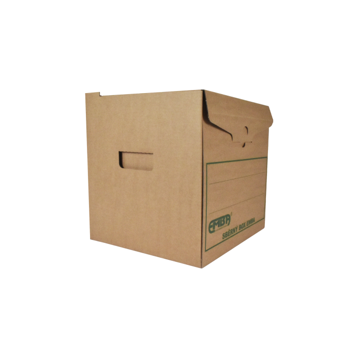 Box na uskladnenie 4 zakladačov so šírkou chrbta 7,5 - 8 cm. Vyrobený z kvalitnej trojvrstvovej vlnitej lepenky H/ H so zelenou potlačou. Konštrukcia boxu je spevnená zosilnením bočných stien. Umožňuje uloženie 4 skupinových boxov na seba, čím nahrádza kovový regál na miestach, kde ho z priestorového hľadiska nie je vhodné umiestniť.
