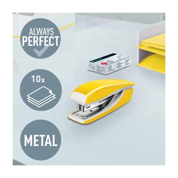 Malá zošívačka v moderných žiarivých farbách ideálna nielen do kancelárie, ale aj domov alebo na cesty. Vždy perfektné zošitie vďaka patentovanej technológii DIT. V kombinácii so spinkamii Leitz Power Performance P2 (č. 10) dosiahnete vždy jednoduché a správne zošitie.Kapacita 10 hárkov. Vrecková zošívačka. Patentovaná technológia DIT na spoľahlivé zošívanie. Balenie v škatuľke, vrátane spiniek. Otvorením ramena o 180° je možné použiť nástenkové zošívanie (takrovanie). Farba žltá.