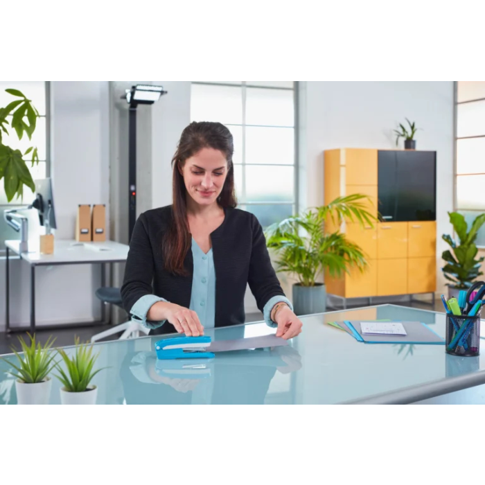 Užitočná celokovová kancelárska zošívačka na každý písací stôl z kolekcie Evolution so stabilnou protišmykovou spodnou časťou. Plastový vrchný diel, integrovaná plastová rozošívačka na zadnej časti, otočná matrica pre otvorený a uzavretý spôsob zošívania. Kapacita náplne 100 spiniek veľkosti 24/6, resp. 150 spiniek veľkosti 26/6. Hĺbka zošívania 5,3 cm. Hmotnosť cca 165 g. Záruka 10 rokov. Farba petrolejová/sivá.