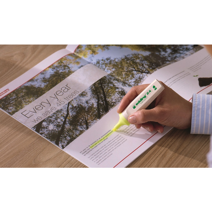 Minimálne 90% tela a uzáveru zvýrazňovača vyrobené z obnoviteľných zdrojov. Zvýrazňovač so zrezaným hrotom so šírkou stopy 2 - 5 mm. Pre zvýraznenie textových pasáží, poznámok a pod. Atrament na vodnej báze s intenzívnymi farbami. Dopĺňateľný atramentom HTK 25. Balenie 10 ks.